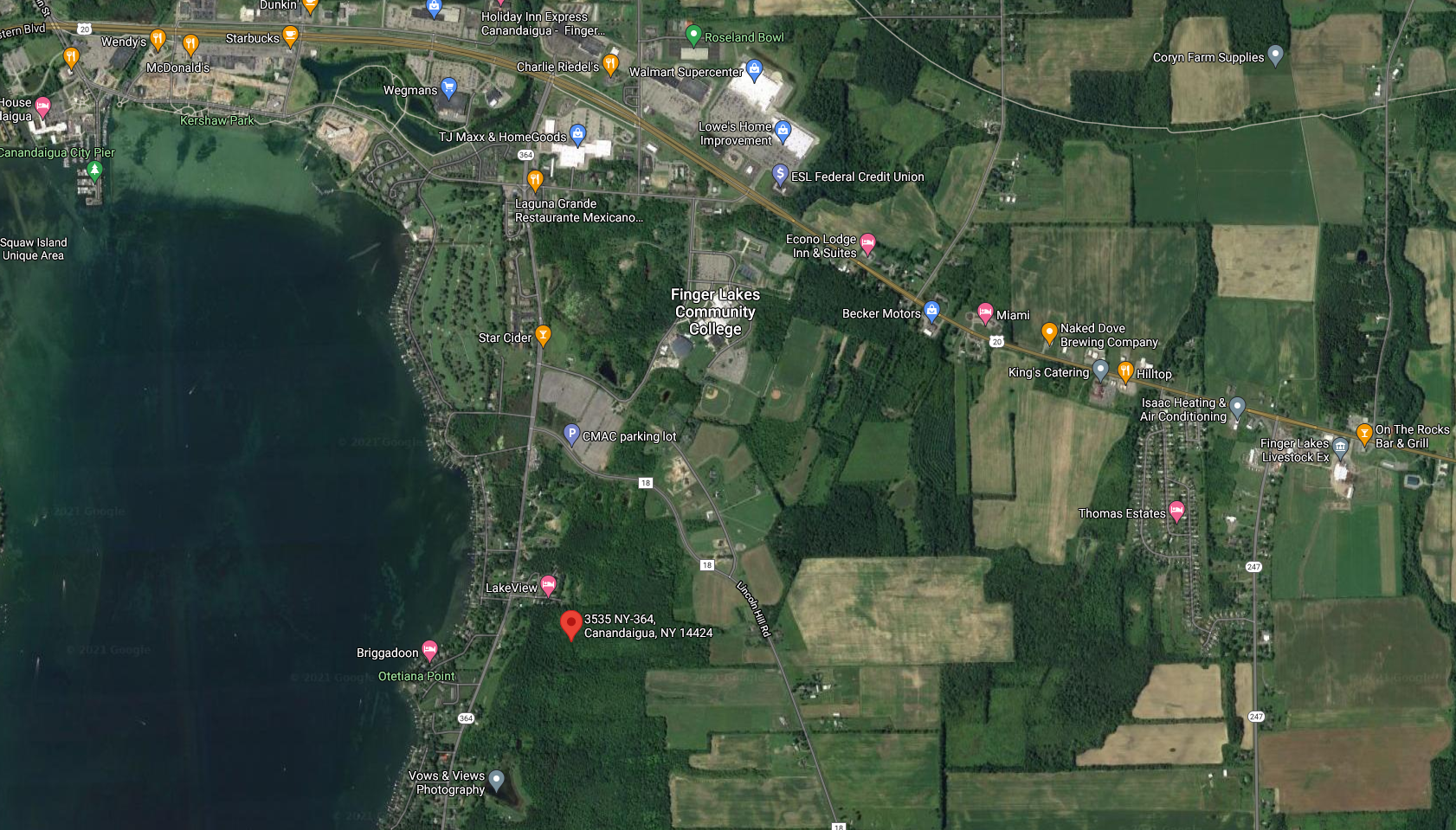Google Maps aerial view showing Rosepark and Rosepark Cottages toward the top, and the location of the proposed Canandaigua Shores development at 3535 NY Route 364 toward the bottom (red marker).